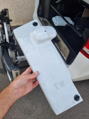Autre micro bricolage, en montant le porte-vélos samedi je me suis rendu compte que de l'eau stagnait au fond de la pièce plastique en place lorsque l'attelage démontable n'est pas en place (lors du dernier trajet on avait pris un gros orage, de ceux qui t'obligent à rouler à 50 sur l'autoroute). J'ai percé pour que l'eau s'évacue car le bas de la prise 13 broches baignait dans l'eau...