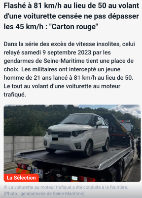 Ca fonctionne drôlement bien la répression, les excès sont de plus en plus importants. Bravo, vive la France et vive la spoilation (il faut dire que les 70% d'impots directs et indirects sont un peu juste, faut aussi prendre le reste). Par chez moi pour améliorer les rentrées fiscales, les 4 voies avec chaussée séparées, rails de sécurité et échangeurs de type autoroutier passent à 90km/h voir 70 km/h. Les villes à 30 km/h (route de campagne inclues), ce qui dans le contexte rend les délits de grand excès de vitesse assez facile à réaliser (même involontairement).